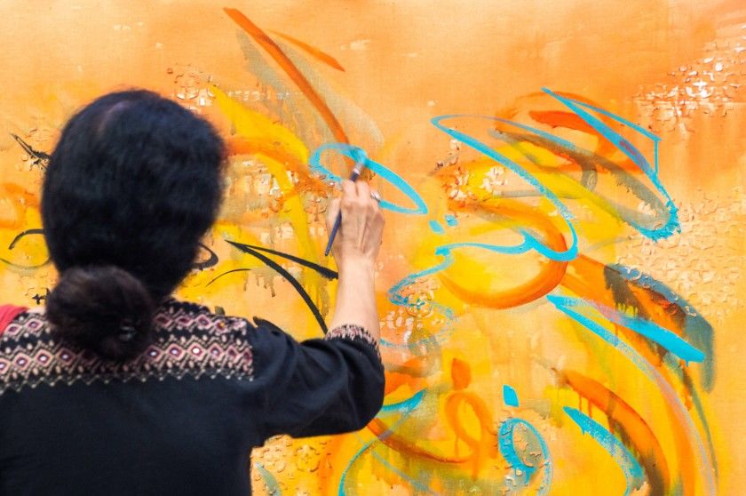 Salma Arastu is part of a movement to modernize Islamic calligraphy. After graduating from art school in India, she converted to Islam, having married a man who was Muslim. Together, they moved to Iran and eventually resettled in California. It was in Iran that Ms. Arastu first encountered Islamic calligraphy, stylized writing of verses from the Quran or the sayings of the prophet Muhammad in Arabic script.